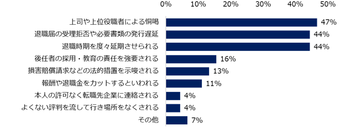 「不当な引きとめ(ハラスメント)に遭遇したことはありますか?」と質問すると、20%が「ある」と回答しました。遭遇したことがある方にどのような引きとめだったかを伺うと、上位は「上司や上位役職者による恫喝」(47%)、「退職届の受理拒否や必要書類の発行遅延」「退職時期を度々延期させられる」(同率44%)でした。その際の対処法に関しても紹介します。