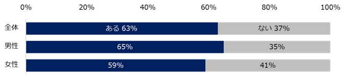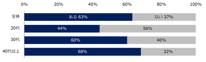 「これまで職場でハラスメントを受けたことがありますか?」と伺うと、63%が「ある」と回答しました。年代別でみると、40代以上が68%と20代の44%より24ポイント高く、年代が高い方ほどハラスメントを受けた経験があることが分かりました。男女での差は、男性のほうが6ポイント高い結果でした。(男性:65%、女性:59%)。