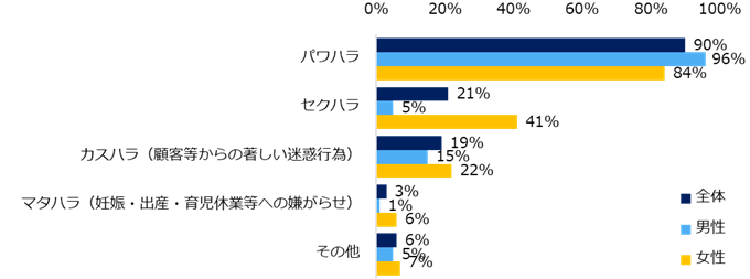 【図5】これまで職場でハラスメントを受けたことが「ある」と回答した方に伺います。どんなハラスメントを受けましたか?(複数回答可/男女別)
