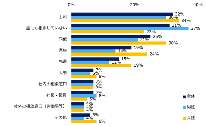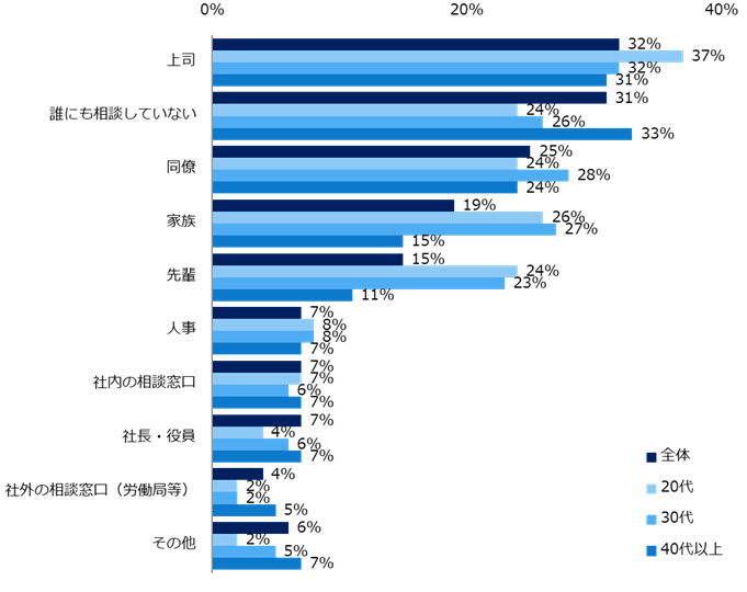 職場でハラスメントを受けたことがある方に「誰かに相談しましたか?」と伺うと、トップ3は「上司」(32%)、「誰にも相談していない」(31%)、「同僚」(25%)でした。年代別では、「誰にも相談していない」で9ポイントの差(20代:24%、40代以上:33%)、「家族」で11ポイントの差(20代:26%、40代以上:15%)、「先輩」で13ポイントの差(20代:24%、40代以上:11%)がありました。男女別で見ると、10ポイント以上差が開いたのは「誰にも相談していない」(男性:37%、女性23%)、「家族」(男性:14%、女性:24%)でした。