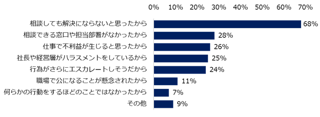 「誰にも相談していない」と回答した方に理由を伺うと、最多は「相談しても解決にならないと思ったから」(68%)でした。