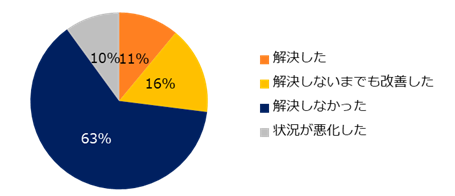 続いて、相談先を「上司、同僚、家族、先輩、人事、社内の相談窓口、社長・役員、社外の相談窓口(労働局等)」のいずれかと回答した方に、相談した結果について伺いました。「解決した」「解決しないまでも改善した」と回答した方は27%(解決した:11%、解決しないまでも改善した:16%)に留まった一方で「解決しなかった」(63%)と「状況が悪化した」(10%)を合わせると73%にのぼり、状況が好転しないケースが多数を占める結果となりました。具体的なエピソードも紹介します。