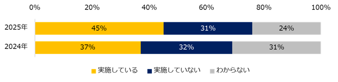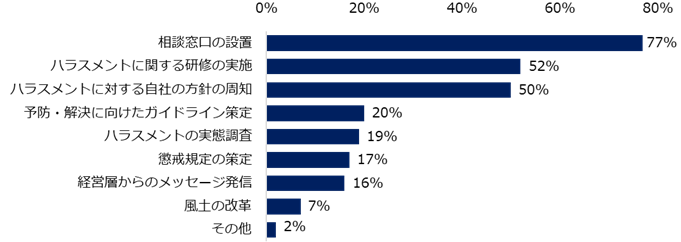 職場のハラスメント対策は45%が「実施している」と回答。昨年(2024年)の同調査(※)と比較して8ポイント上昇した一方、依然として約3社に1社は「実施していない」(31%)という実態が明らかになりました。「実施している」と回答した方に具体的な取り組みを伺うと、上位は「相談窓口の設置」(77%)、「ハラスメントに関する研修の実施」(52%)、「ハラスメントに対する自社の方針の周知」(50%)でした。続けて、ハラスメントのない職場にするために企業にして欲しいことを伺うと、最多は「相談窓口の設置」(43%)でした。企業に実施してほしい対策の詳細も紹介します。