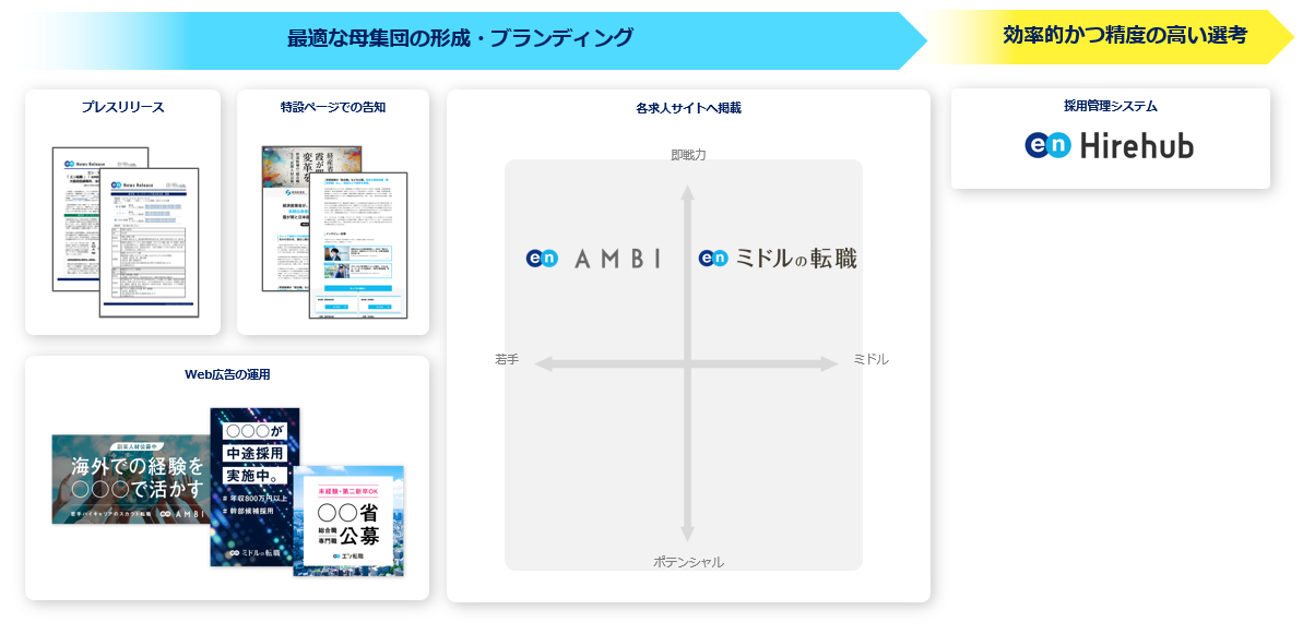 プレスリリースや特設ページ、Web広告での告知に加え、各求人サイトでの集客支援を実施。『ミドルの転職』『AMBI』とターゲットの異なる求人サイトを活用することで、ターゲットへ網羅的に求人を届けます。さらに、採用管理システム『Hirehub』の提供により、選考フローを支援。求職者との適切なマッチングを実施します。