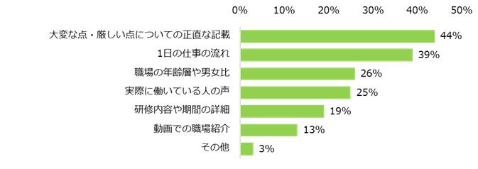 「求人情報を見る際に、特に注意して見る項目はどれですか?」と伺うと、最多は「“誰でも簡単”“未経験でも高時給”などの甘い言葉」(53%)でした。続けて、ギャップをなくすために求人情報に加えてほしい情報を伺うと、最多は「大変な点・厳しい点についての正直な記載」(44%)、次いで「1日の仕事の流れ」(39%)が続きました。これまで求人情報が正直だった、信頼できたと感じたエピソードも紹介します。
