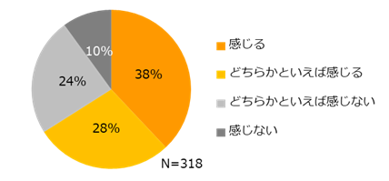 派遣で就業中の318名に「あなたの職場ではデジタル化が進んでいると感じますか?」と伺うと66%が「感じる」(感じる:38%、どちらかといえば感じる:28%)と回答しました。