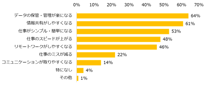 デジタル化が進んでいると「感じる」「どちらかといえば感じる」と回答した方に、どのようなデジタル化が進んでいるかを伺うと、トップは「ペーパーレス化」(81%)でした。続けて、デジタル化のメリットについて質問すると、上位は「データの保管・管理が楽になる」(64%)、「情報共有がしやすくなる」(61%)でした。