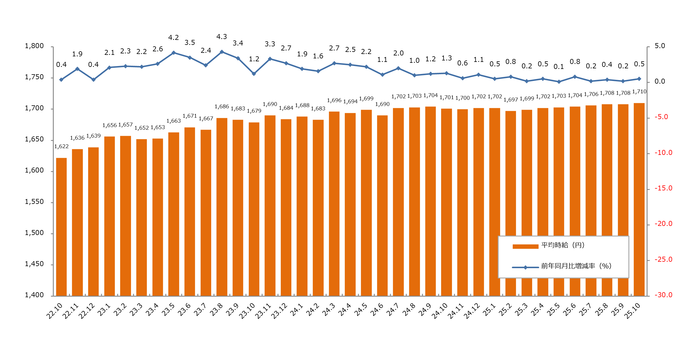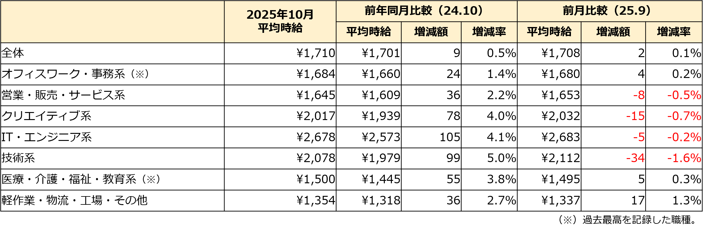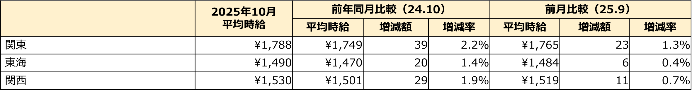 2025年10月度の三大都市圏平均時給は1,710円(前月比+2円・0.1%増、前年同月比+9円・0.5%増)で、過去最高時給を更新。前年同月を上回るのは38ヵ月連続です。