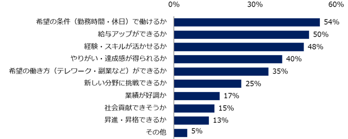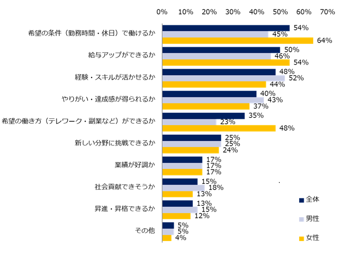 男女別では、男性は「経験・スキルが活かせるか」(52%)、女性は「希望の条件(勤務時間・休日)で働けるか」(64%)がそれぞれ最多になりました。それぞれ重視する理由も紹介します。