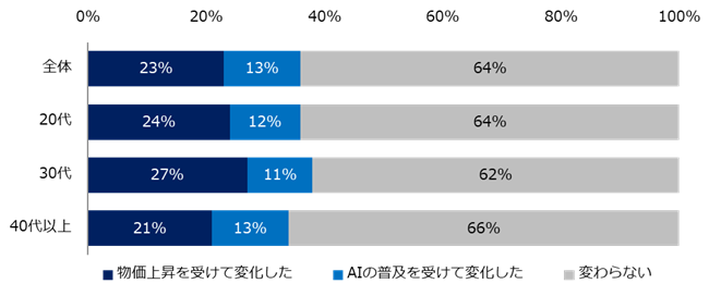 近年続く”物価上昇”や”AIの普及”をきっかけに、仕事選びを見直したかを質問しました。「変わらない」が64%と半数を超えましたが、23%と約4人に1人が「物価上昇を受けて変化した」と回答。また、13%が「AIの普及を受けて変化した」と回答しました。