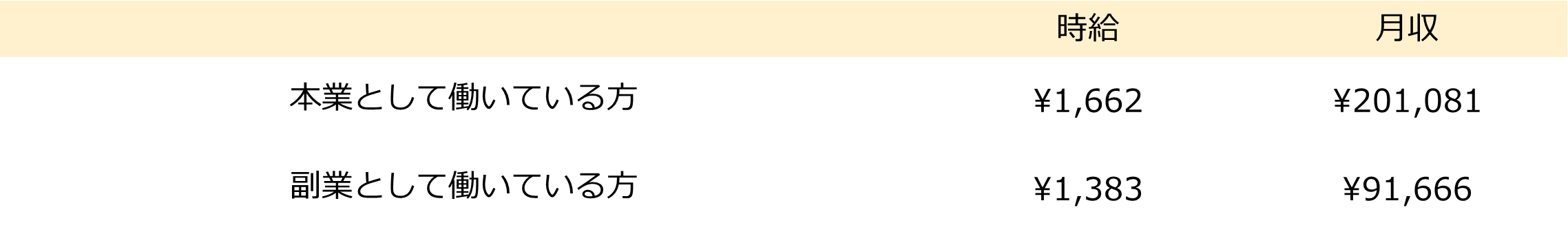 【表1】時給・月収(本業として働いている方/副業として働いている方)