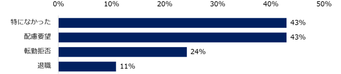 「直近3年間、社員から転勤辞令に対する配慮要望、拒否、退職はありましたか?」と伺うと、「特になかった」が43%で同率で最多になったものの、「配慮要望」43%、「拒否」24%、「退職」11%という結果になりました。