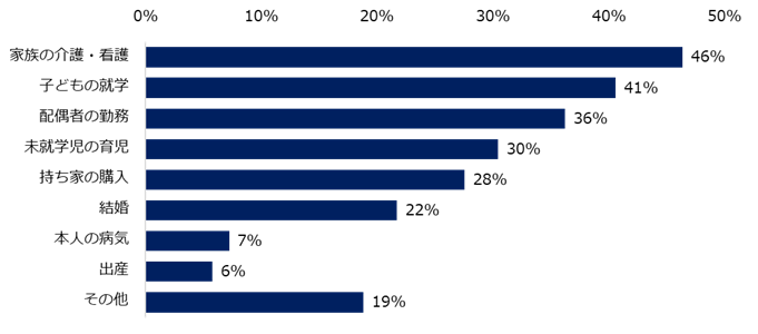 家族の介護、子どもの就学、配偶者の勤務など家庭の状況が転勤の壁に。 ー人事・採用担当者向け情報サイト『人事のミカタ』アンケートー