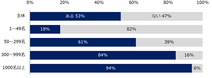 転勤制度の有無を聞くと「ある」が53%、「ない」が47%でした。従業員数別で見ると、1,000名以上の企業は94%が「ある」と回答し、従業員数が多い企業ほど転勤制度があることが分かりました(1~49名:18%、50~299名:61%、300~999名:84%)。