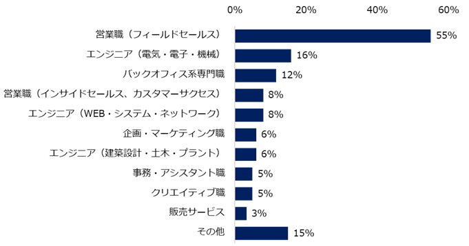転勤制度があると回答した企業に、”転勤頻度が高い職種”を聞きました。トップは「営業職(フィールドセールス)」(55%)で、次点の「エンジニア(電気・電子・機械)」(16%)と39ポイントの開きがありました。