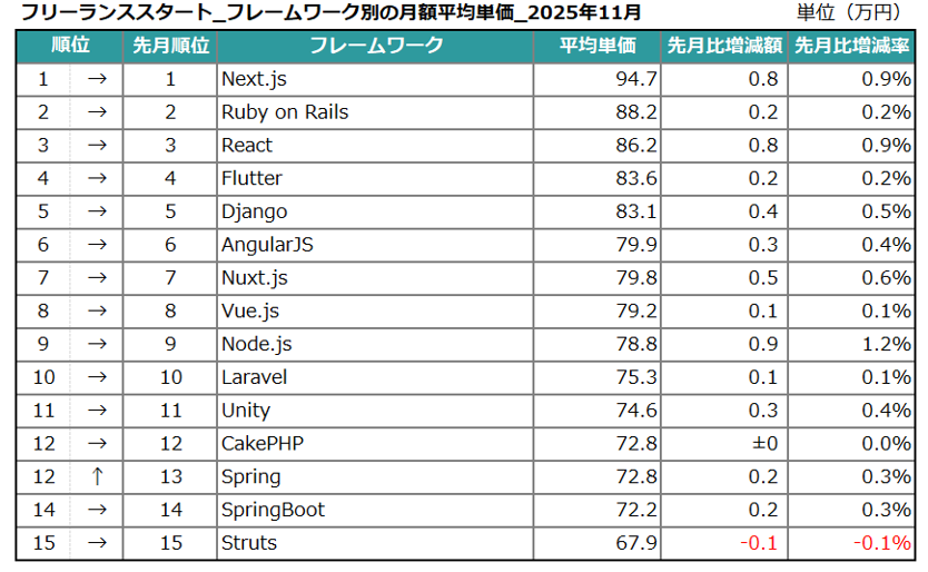 フレームワーク別の月額平均単価(上位15位)を見ると、全てのフレームワークにおいて先月からの順位変動は見られませんでしたが、その中でも1位の「Next.js」が94.7万円と8ヵ月連続で単価が上昇し続けています。現代のWeb開発における企業の重要課題を解決できる付加価値の高い技術として、フリーランスITエンジニア市場から評価され続けていることがうかがえます(+0.8万円/0.9%増)。