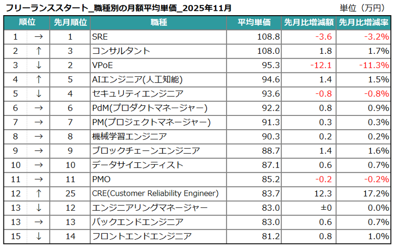 また、「CRE」の単価が83.7万円(+12.3万円/17.2%増)と急上昇しています。テクニカルサポートを通じて顧客の信頼性を担保する役割が重視され、技術的な専門性を持つ人材の需要が高まっていると推測されます。