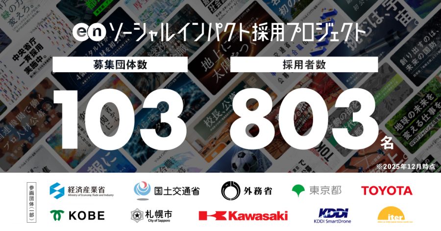 社会的インパクトが特に大きい人材採用「ソーシャルインパクト採用」を、エンが全社を挙げて支援するプロジェクトです。中央省庁の幹部候補、自治体の副市長やDX担当、さらにはNGO/NPO・スポーツ団体・志ある企業の中核メンバー等、さまざまな募集を「入職後の活躍」までこだわって支援しています。優れた能力を「より良い世の中を作るため」に使いたい方と、より良い世の中を作るために優れた人材の力を必要とする団体を結び、社会の課題解決を加速させていくプロジェクトです。