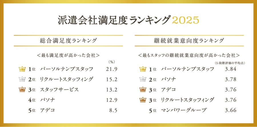 「派遣会社満足度ランキング2025」を発表 派遣スタッフ3100人の声から、満足度の高い派遣会社ベスト5が決定
