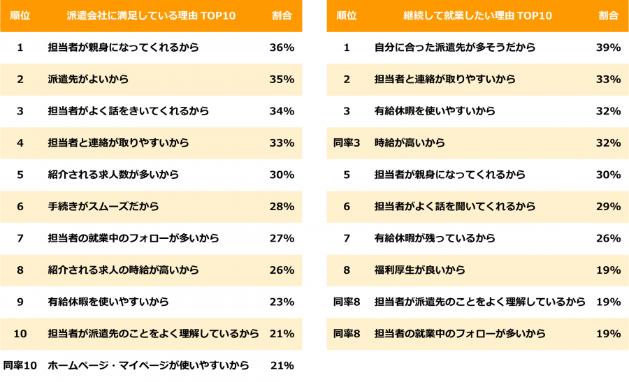 「派遣会社に満足している理由」と「継続して就業したい理由」を聞くと、トップ10は以下になりました。満足度ランキング、継続就業意向度ランキングの上位に挙がった派遣会社は、これらのポイントが平均を上回る傾向にあります。各社のスコアの詳細は、ランキング詳細をご覧ください。