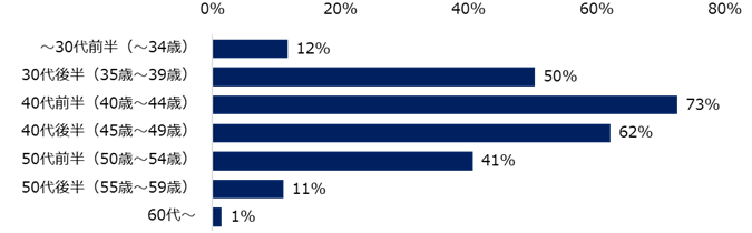 「年収1,000万円以上の求人が増えている」と回答した方に、ターゲットの年齢層を伺いました。上位は「40代前半」(73%)、「40代後半」(62%)で、次点の「30代後半」(50%)と10ポイント以上の開きがありました。40代の需要の高まりがうかがえます。