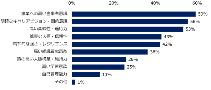 続けて、同ポジションに転職成功する方に共通する”能力”を伺うと、上位は「事業課題の発見・戦略策定力」(55%)、「新規事業創出力」(46%)でした。共通する”スタンス・志向性”を伺うと、上位は「事業への高い当事者意識」(59%)、「明確なキャリアビジョン・目的意識」(56%)でした。