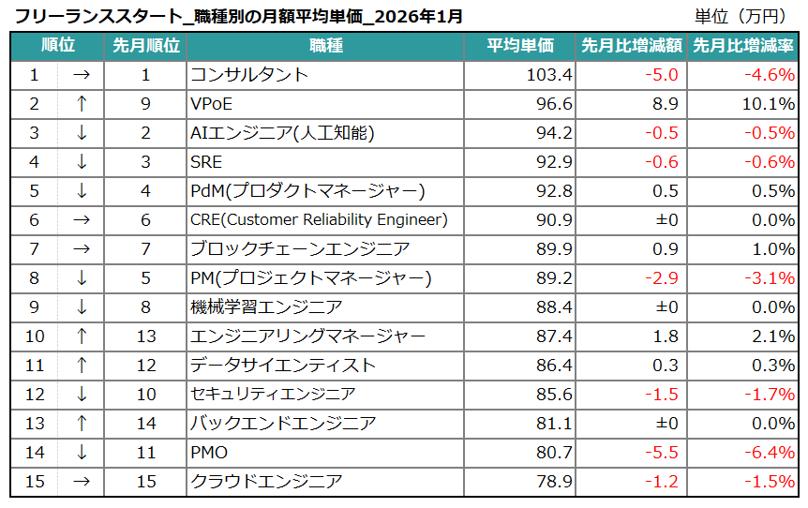 職種別では「VPoE」の平均単価が急上昇 エン運営『フリーランススタート』定点調査レポート