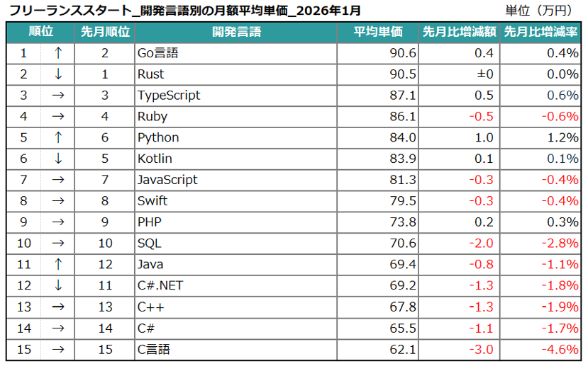 開発言語別では、2025年12月度に前月比マイナスとなっていた「Go言語」の平均単価が、90.6万円(+0.4万円/0.4%増)と、再び上昇しました。Webサービスのバックエンド開発や、高いパフォーマンスが求められるクラウドインフラの構築といった領域での採用が堅調なため、その需要は引き続き高いことがうかがえます。
