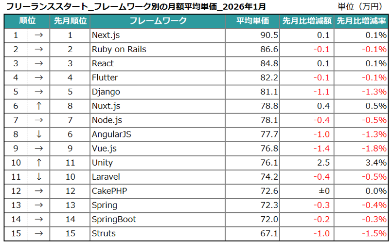 フレームワーク別の月額平均単価(上位15位)を見ると、1位の「Next.js」は、平均単価90.5万円(+0.1万円/0.1%増)となり、7ヵ月連続で首位を維持しています。SEOに強く高速なサイトを効率的に構築できるため、企業のWeb戦略において不可欠な技術となっており、高い需要が続いていることがうかがえます。