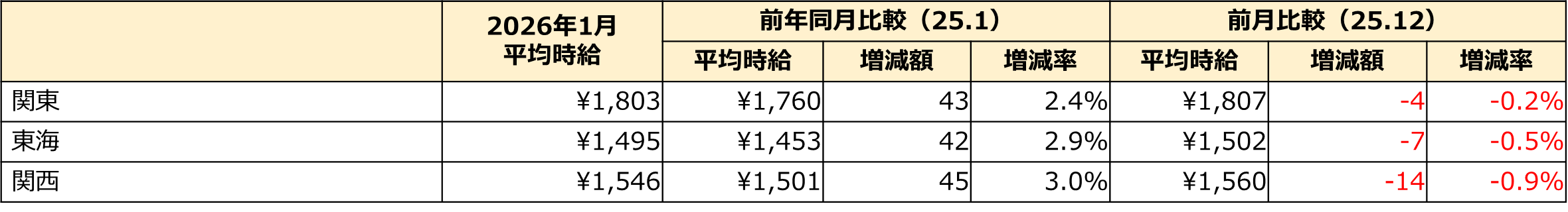 2026年1月度の三大都市圏平均時給は1,714円(前月比±0円・横ばい、前年同月比+12円・0.7%増)で過去最高を維持。前年同月を上回るのは40ヵ月連続です。