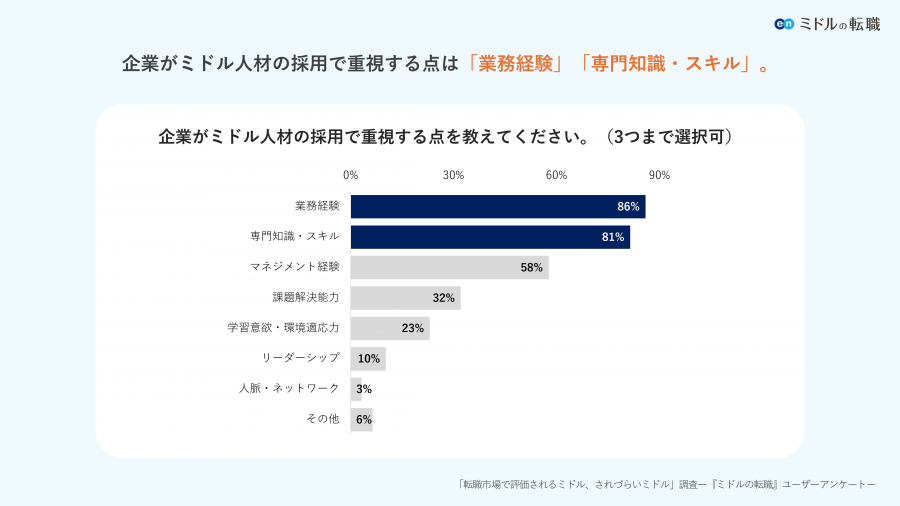企業がミドル人材の採用で重視する点を伺うと、上位は「業務経験」(86%)、「専門知識・スキル」(81%)でした。理由や具体的なエピソードも伺うと、「実務に沿った経験があれば年齢の要件も緩和するケースもある」といった回答が寄せられました。