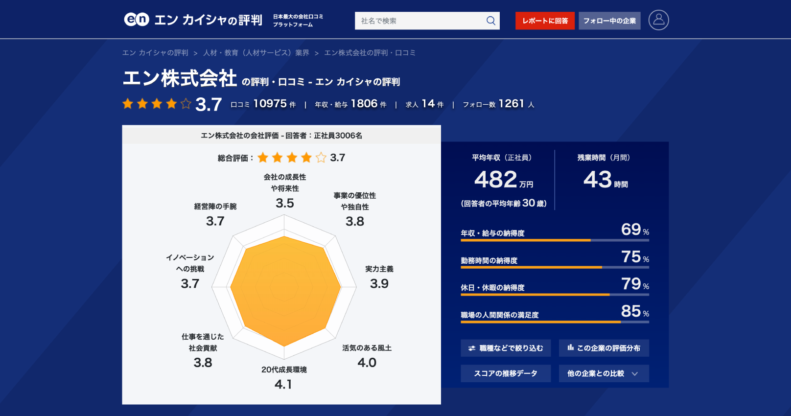 エンの社員・元社員が記入した口コミを閲覧できるページ。カルチャー、成長環境、働き方など、様々な観点から寄せられたリアルな声を公開しています。